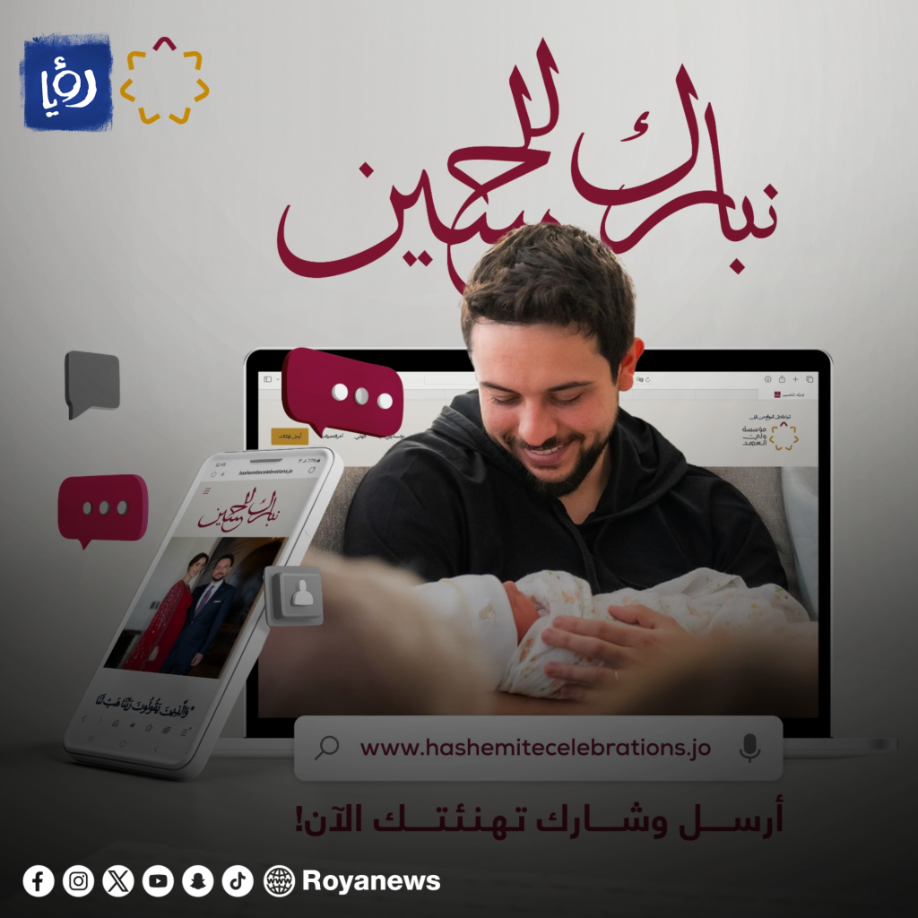أطلقت مؤسسة ولي العهد، السبت، منصة إلكترونية تحمل اسم "نبارك للحسين" مخصصة لإرسال التهاني والتبريكات للأمير الحسين بن عبدالله الثاني، ولي العهد، وسمو الأميرة رجوة الحسين، بمناسبة قدوم المولودة الجديدة الأميرة إيمان بنت الحسين بن عبدالله الثاني.
