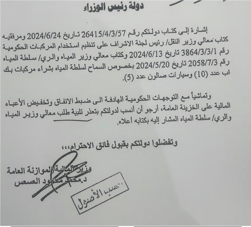 "اشاره الى كتاب دولتكم ومرفقيه كتاب معالي وزير النقل رئيس لجنه الاشراف على تنظيم استخدام المركبات الحكوميه وكتاب معالي وزير المياه والري سلطه المياه بخصوص السماح لسلطة المياه بشراء مركبات بيك اب على عشره و سيارات صالون عدد خمسه، وتماشيا مع التوجهات الحكومية الهادفه الى ضبط الانفاق وتخفيض الاعباء المالية على الخزينة العامة ارجو ان انسب لدولتكم بتعذر تلبية طلب معالي وزير المياه والري سلطه المياه المشار اليه".