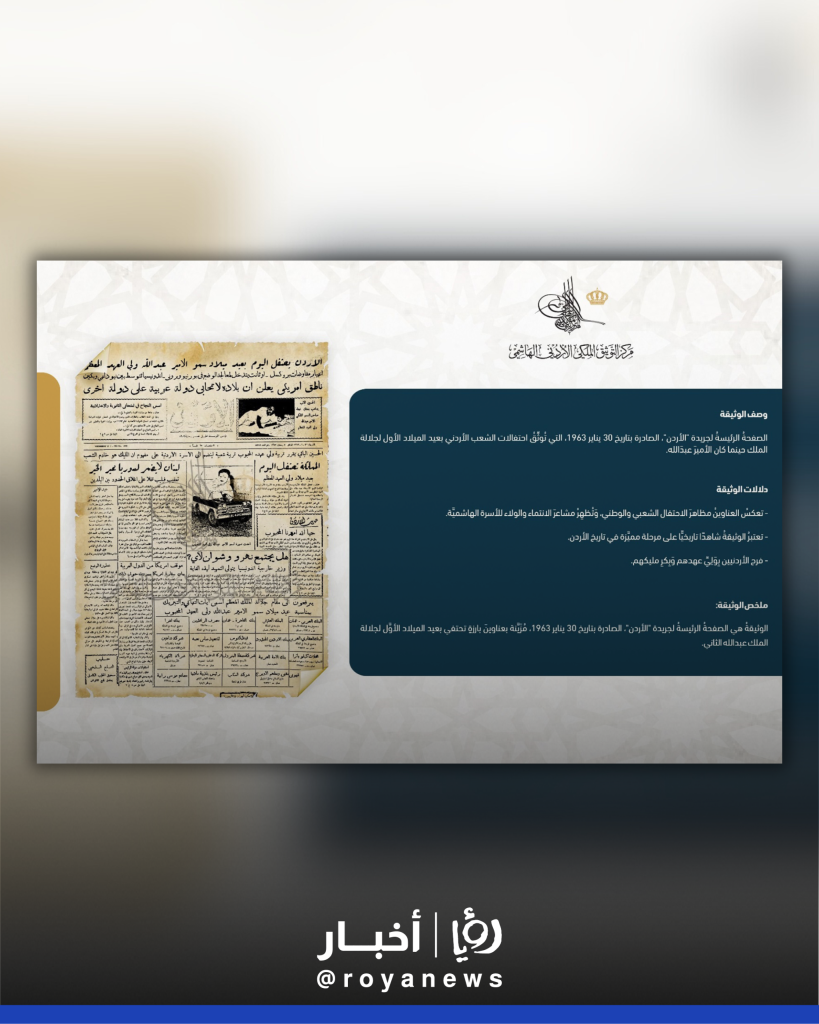 عرض مركز التوثيق الملكي الأردني الهاشمي وثيقة تاريخية بمناسبة ذكرى ميلاد جلالة الملك عبدالله الثاني بن الحسين، تبرز الصفحة الرئيسة من العدد الصادر بتاريخ 30 كانون الثاني من عام 1963 لجريدة "الأردن"، والتي تظهر الاحتفاء بعيد الميلاد الأول لجلالته الذي كان حينها الأمير عبدالله.