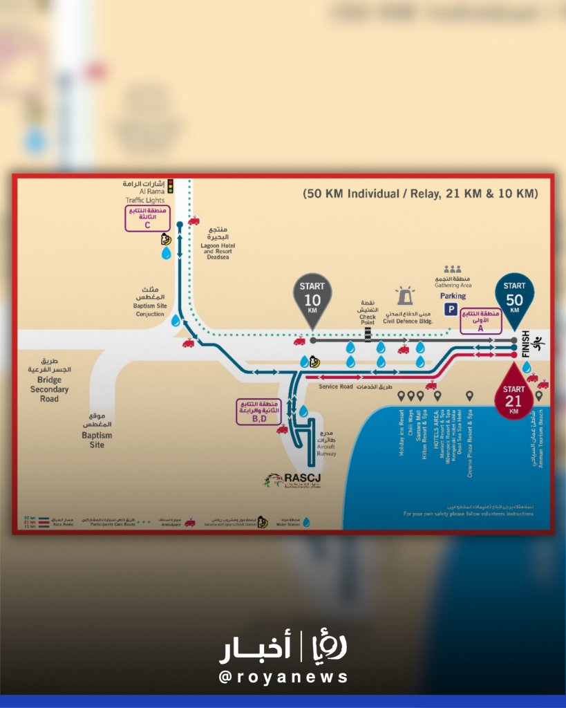 وأضافت الجمعية الأردنية للماراثونات أن إغلاق جميع الطرق المؤدية إلى مسار الالتراماراثون ابتداء من بعد منتصف ليل يوم الجمعة (الساعة 12 منتصف الليل) وحتى الواحدة بعد الظهر من نفس اليوم الموافق11 نيسان على النحو التالي: إغلاق الطريق من إشارات الرامة باتجاه مثلث المغطس باتجاه واحد، وذلك ابتداء من الساعة 12 بعد منتصف الليل وحتى الساعة الواحدة من ظهر يوم الجمعة.