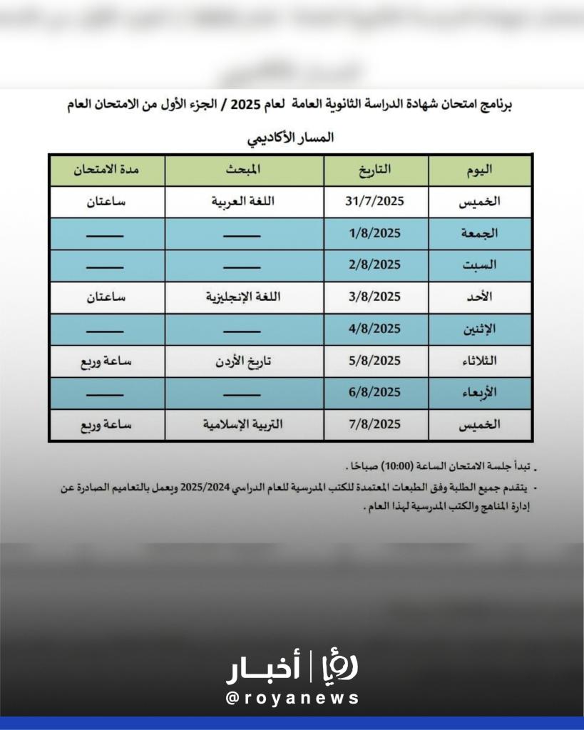 وسيبدأ أول أيام الامتحانات الخميس الموافق 31 تموز 2025، وتختتم الامتحانات يوم الخميس الموافق 7 آب 2025.
