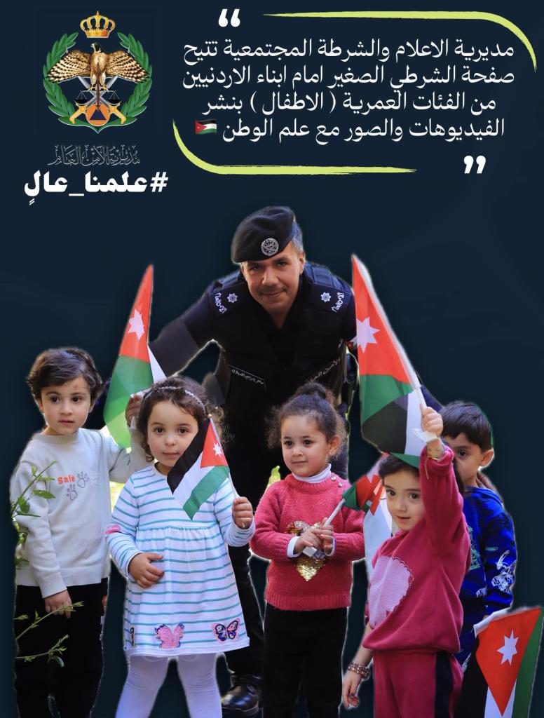 أتاحت مديرية الاعلام والشرطة المجتمعية اليوم الأربعاء صفحة الشرطي الصغير أمام أبناء الاردنيين من الفئات العمرية ( الاطفال ) بنشر الفيديوهات والصور مع علم الوطن.