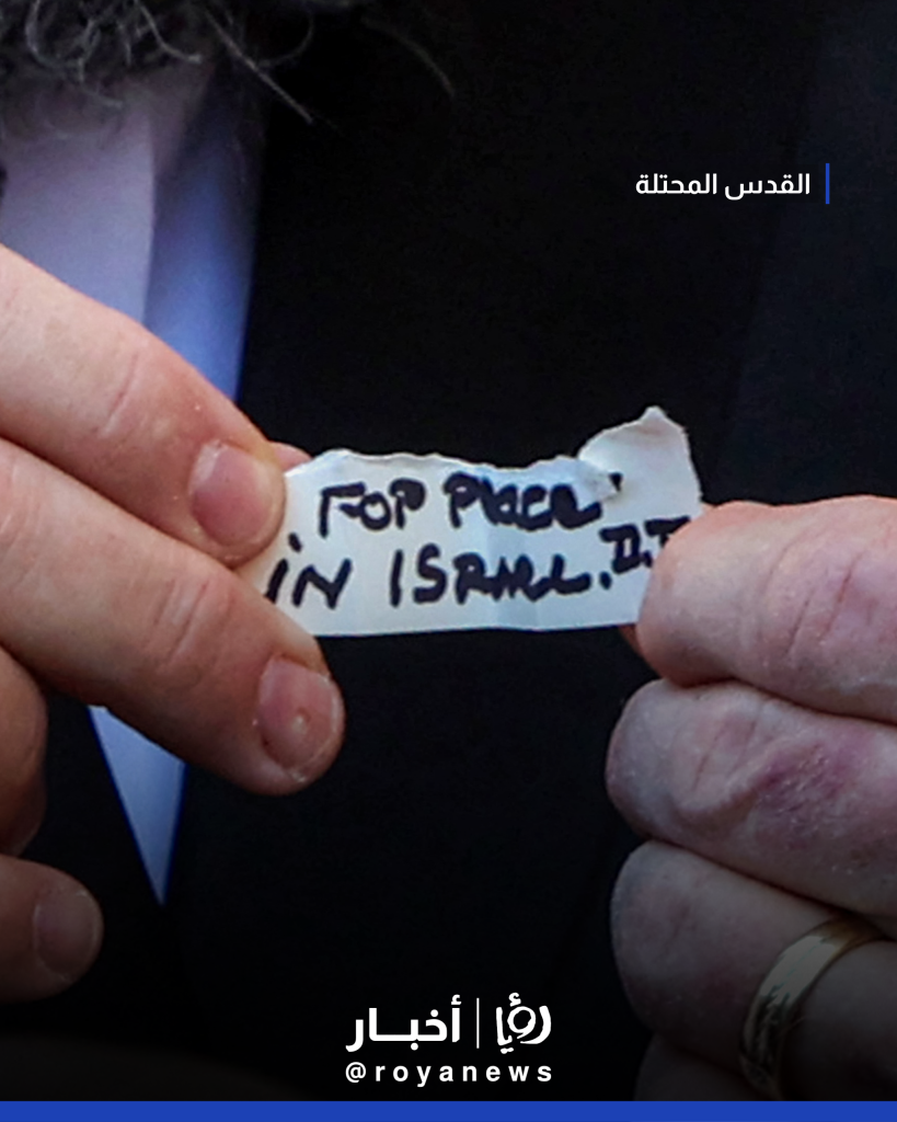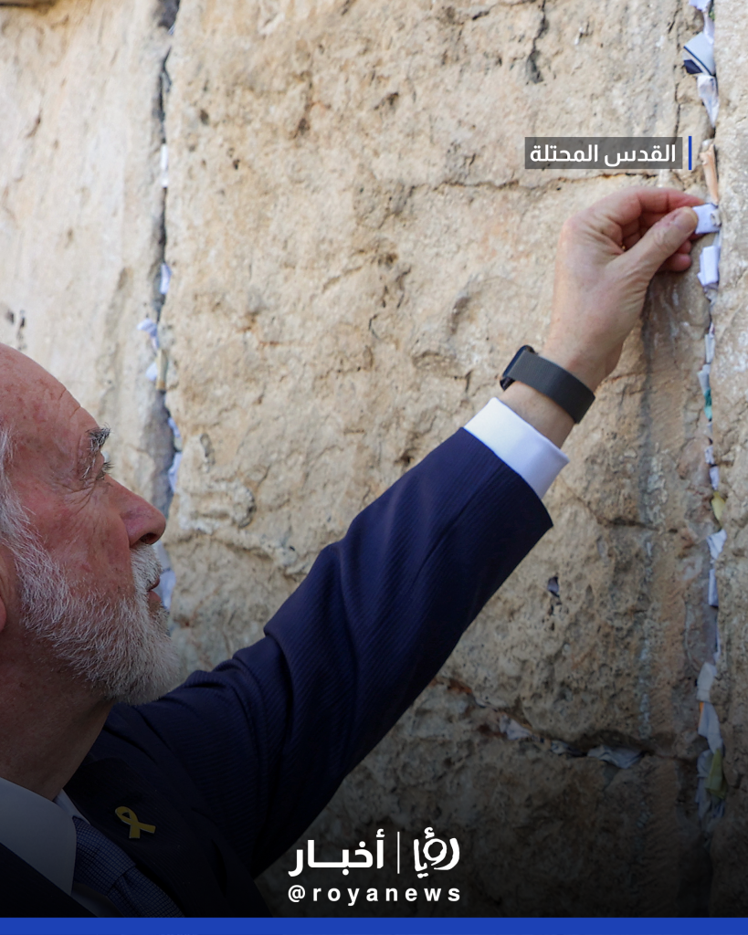 تواجد السفير الأمريكي الجديد لدى تل أبيب، مايك هاكابي، عند حائط البراق في القدس المحتلة، حيث وضع رسالة خطية كتبها الرئيس الأمريكي دونالد ترمب بخط يده، عبر فيها عن أمله في تحقيق السلام في كيان الاحتلال.