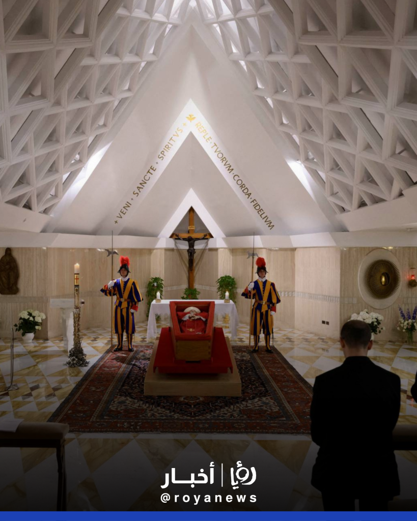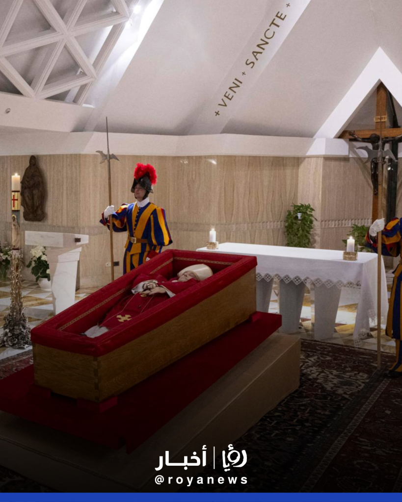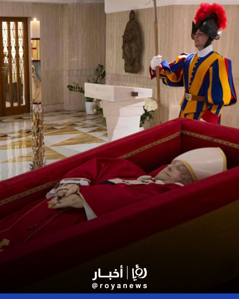 نشر الفاتيكان، الثلاثاء، الصور الأولى للبابا فرنسيس وهو مسجى في نعشه داخل كنيسة بيت القديسة مرتا، مقر إقامته، حيث بدا مرتديا رداء كنسيا أحمر، وعلى رأسه تاج أسقفي أبيض، وبين يديه مسبحة، بينما وقف عنصران من الحرس السويسري بجواره.