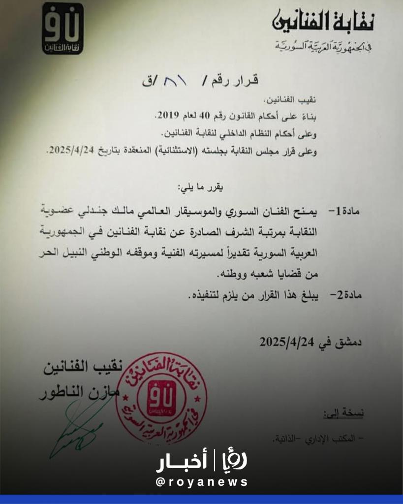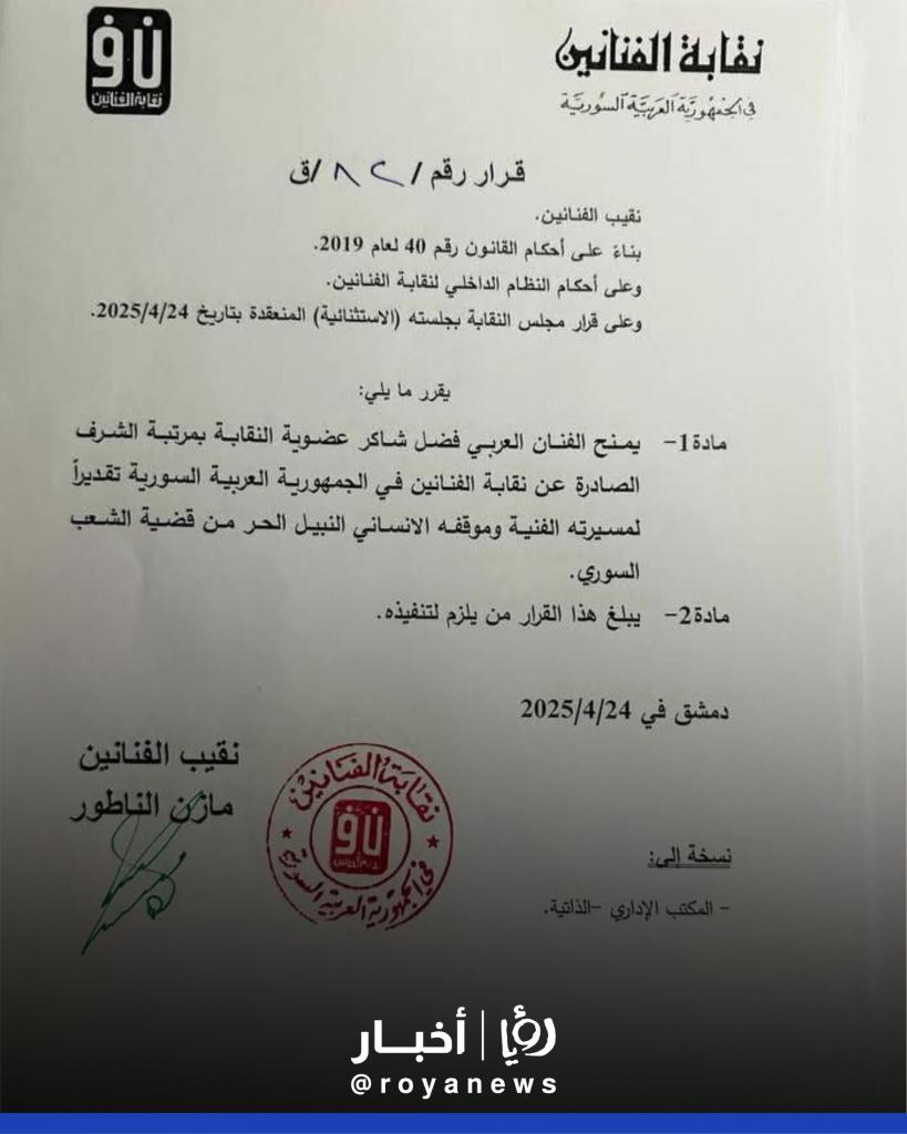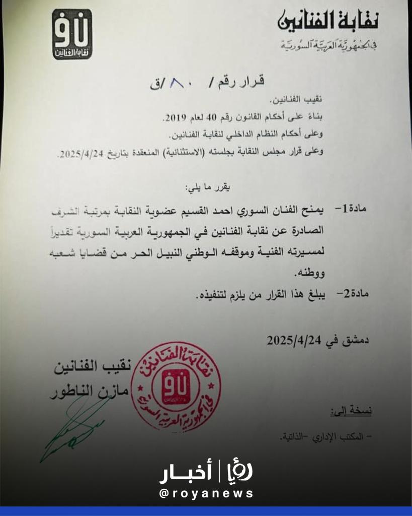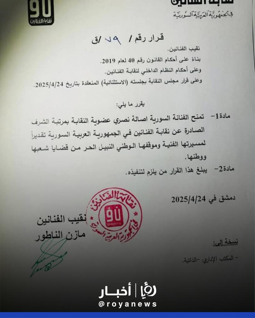 - نقابة الفنانين السوريين: القرار يدخل حيز التنفيذ اعتبارا من تاريخه