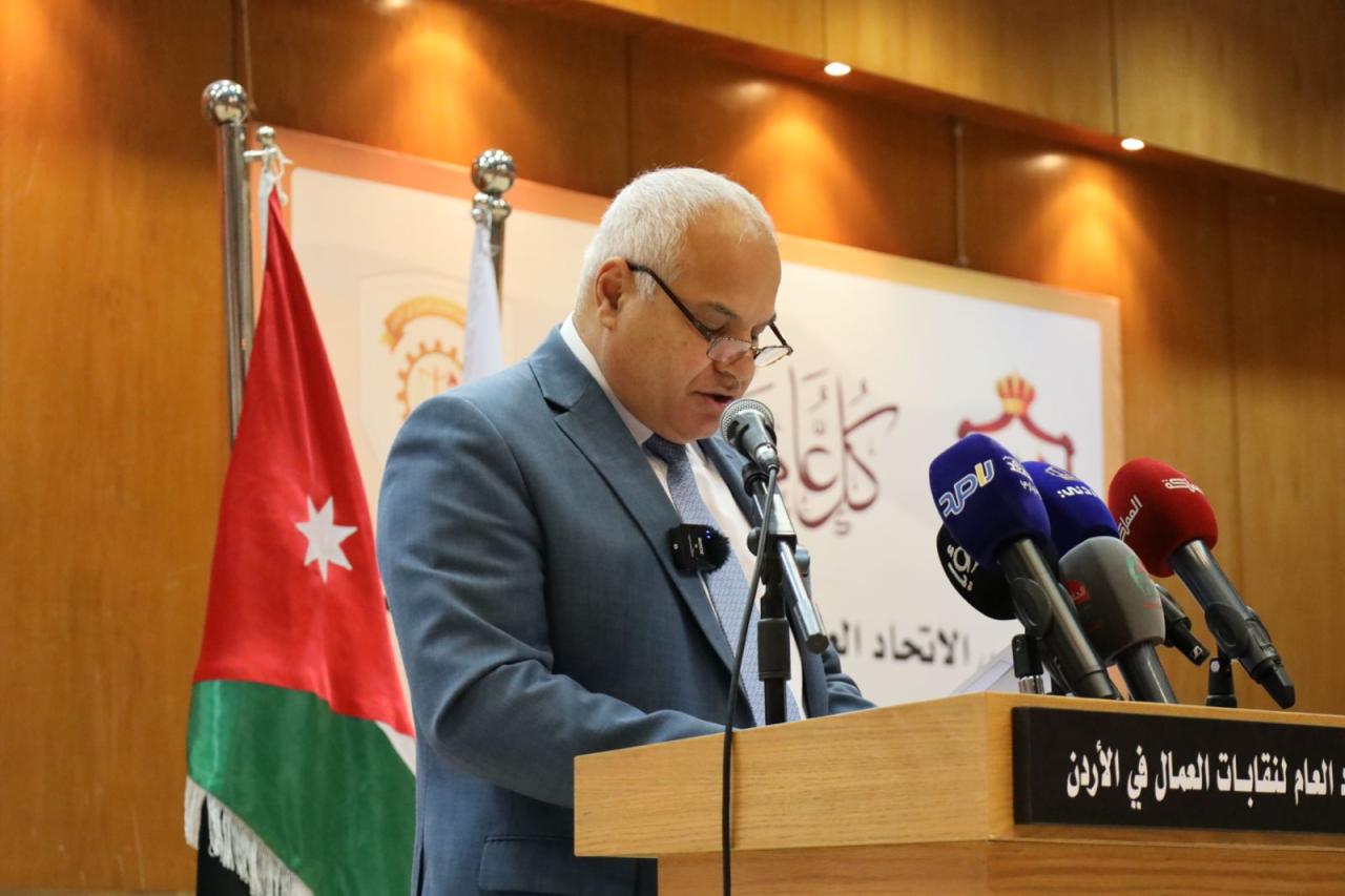 بدوره، قال رئيس الاتحاد العام لنقابات عمال الأردن، خالد الفناطسة"إن الاتحاد العام لنقابات عمال الأردن يمثل الصوت الصادق للعمال، والمظلة النقابية التي تدافع عن حقوقهم، قطع خلال العام الماضي شوطا في مسيرة استعادة دوره التاريخي والوطني، كأكبر مؤسسة مجتمع مدني في الاردن، تضم أكثر من مليون عامل، ومعنية بالدفاع عن حقوقهم وتعزيز مكتسباتهم".