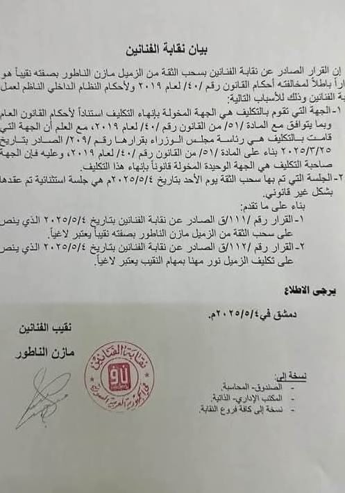 وبناء عليه، أكد البيان أن "قرار سحب الثقة من الزميل مازن الناطور يعتبر لاغيا، وكذلك القرار المتعلق بتكليف الفنان نور مهنا بمهام النقيب".