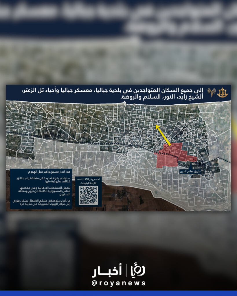 وشمل الإنذار سكان بلدية جباليا، معسكر جباليا، وأحياء تل الزعتر، الشيخ زايد، النور، السلام، والروضة، حيث قال جيش الاحتلال إنه سيهاجم "بقوة شديدة" كل منطقة تطلق منها القذائف الصاروخية.