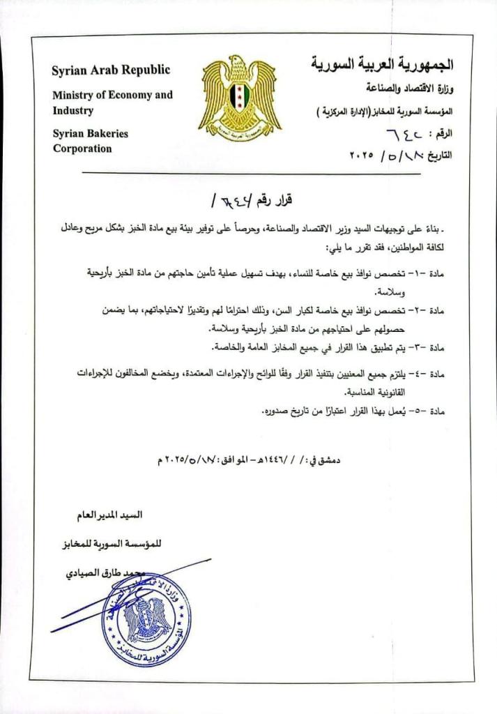 وجه وزير الاقتصاد والصناعة في سوريا بتخصيص نوافذ بيع خاصة بالنساء وكبار السن في جميع المخابز العامة والخاصة على امتداد الأراضي السورية، في خطوة تهدف إلى تسهيل حصولهم على الخبز دون عناء أو انتظار طويل.