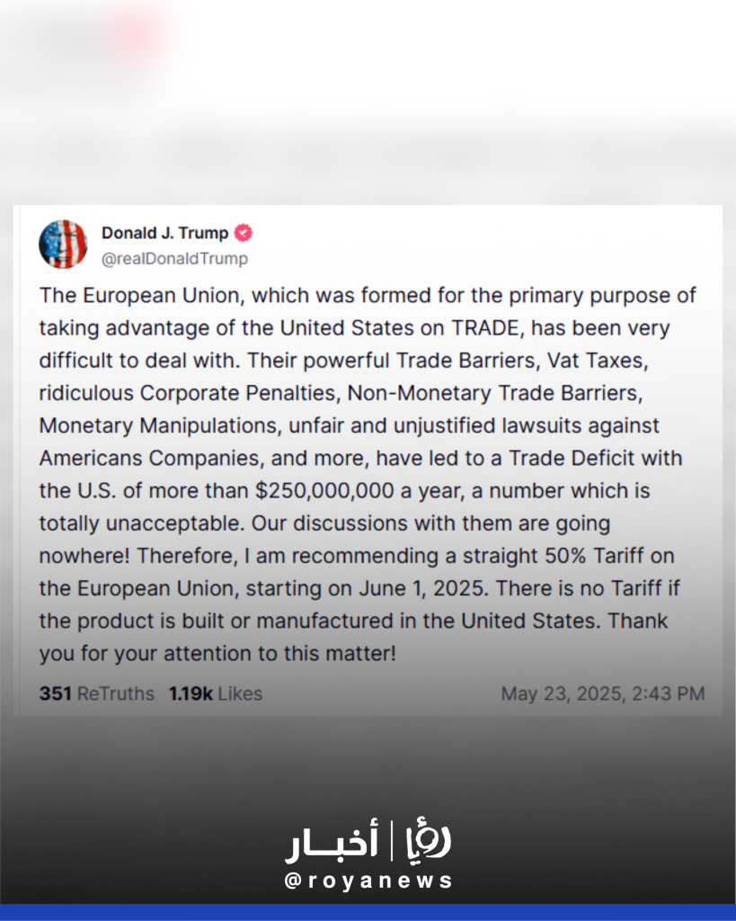أوصى الرئيس الأمريكي دونالد ترمب، في منشور عبر منصته الرسمية، بفرض تعرفة جمركية بنسبة 50% على واردات الاتحاد الأوروبي اعتبارا من الأول من حزيران 2025.