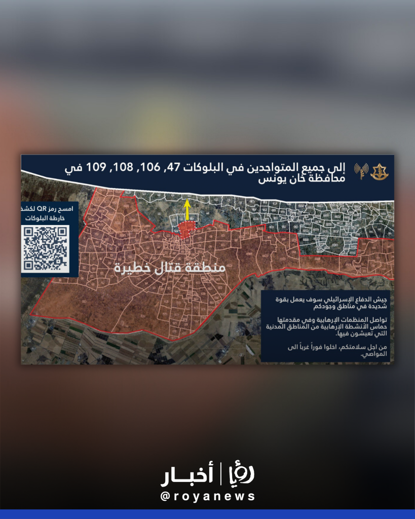 ونشر جيش الاحتلال في تغريدة نشرت الاثنين، خارطة حول تحركات جيش الاحتلال في مناطق البلوكات 47، 106، 108، و109 بمحافظة خان يونس.