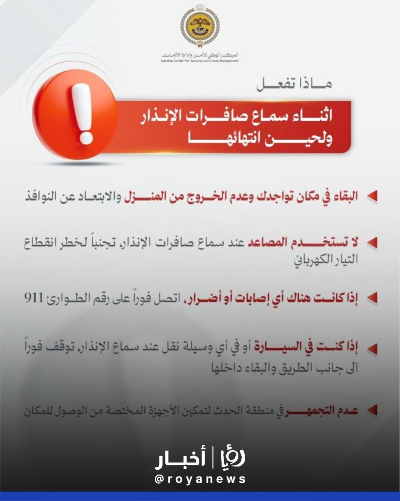 - الأمن العام: إطلاق صافرات الإنذار التحذيرية في جميع مناطق المملكة