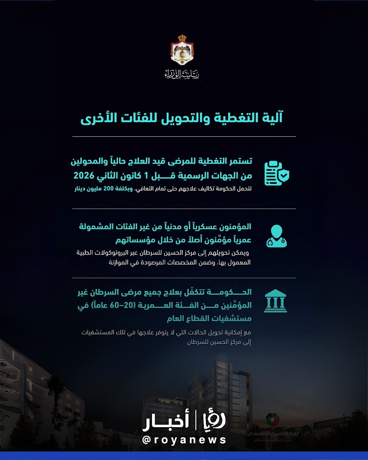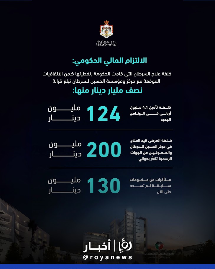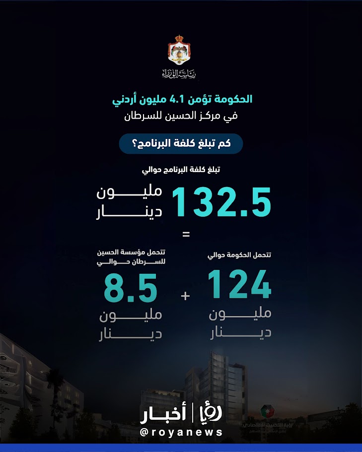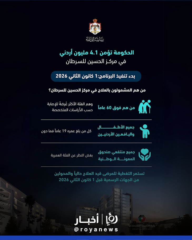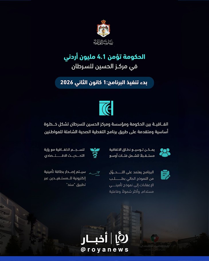 وأكدت الحكومة أن هذا البرنامج، الذي يغطي 4.1 مليون أردني، يتم تنفيذه بالتعاون مع مركز الحسين للسرطان، حيث خصصت موازنة بقيمة 124 مليون دينار لضمان تقديم خدمات علاجية متكاملة لهذه الفئات.