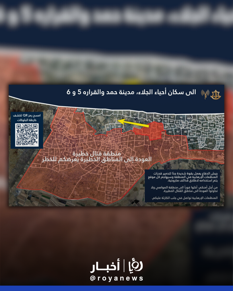 - جيش الاحتلال يحذر سكان أحياء الجلاء ومدينة حمد والقرارة في قطاع غزة ويدعو إلى الإخلاء