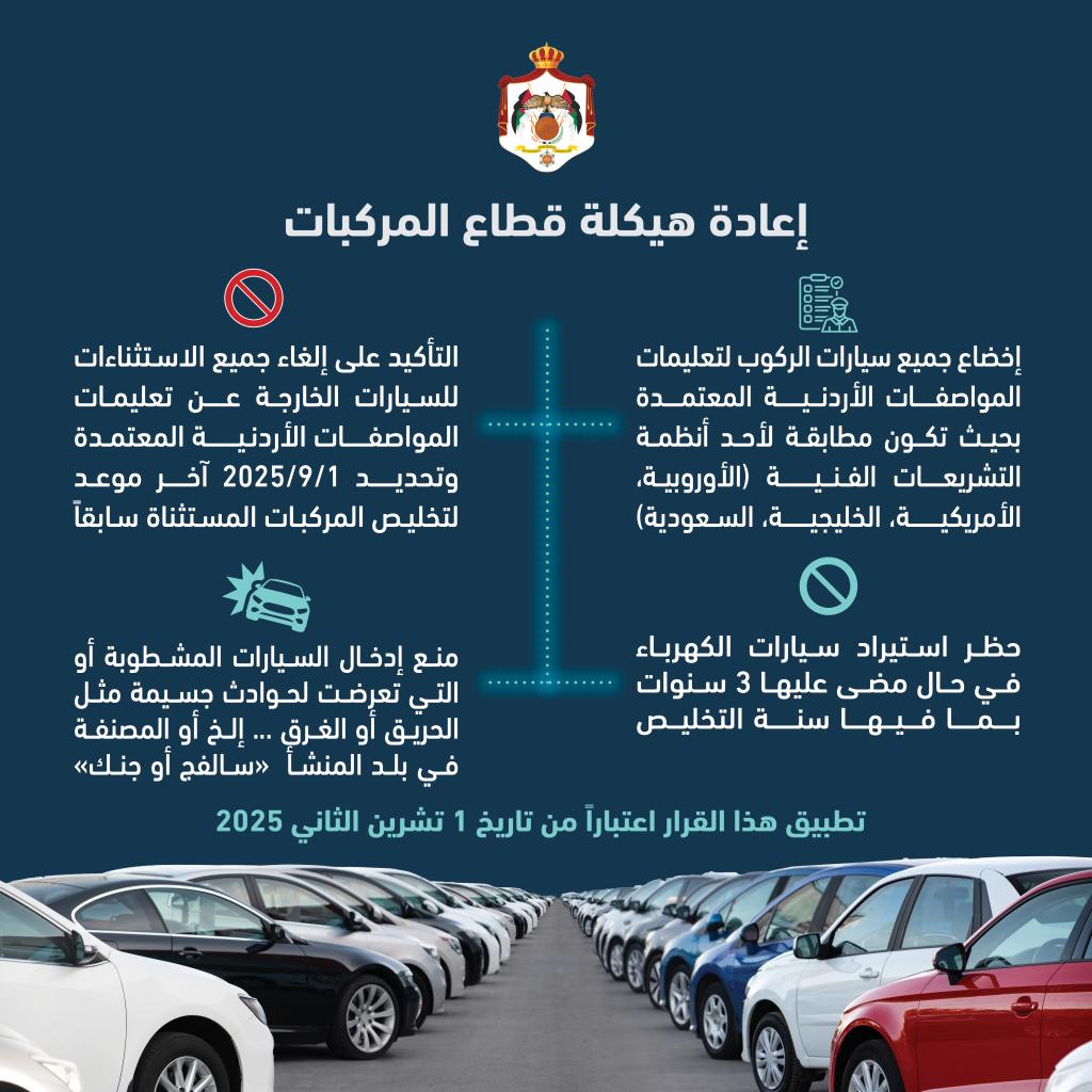 تأتي هذه القرارات ضمن حزمة إصلاح هيكلي وشمولي لقطاع المركبات في الأردن، وبهدف تحقيق التوازن والاستدامة وضمان الالتزام بالمعايير الفنية والسلامة المعتمدة.