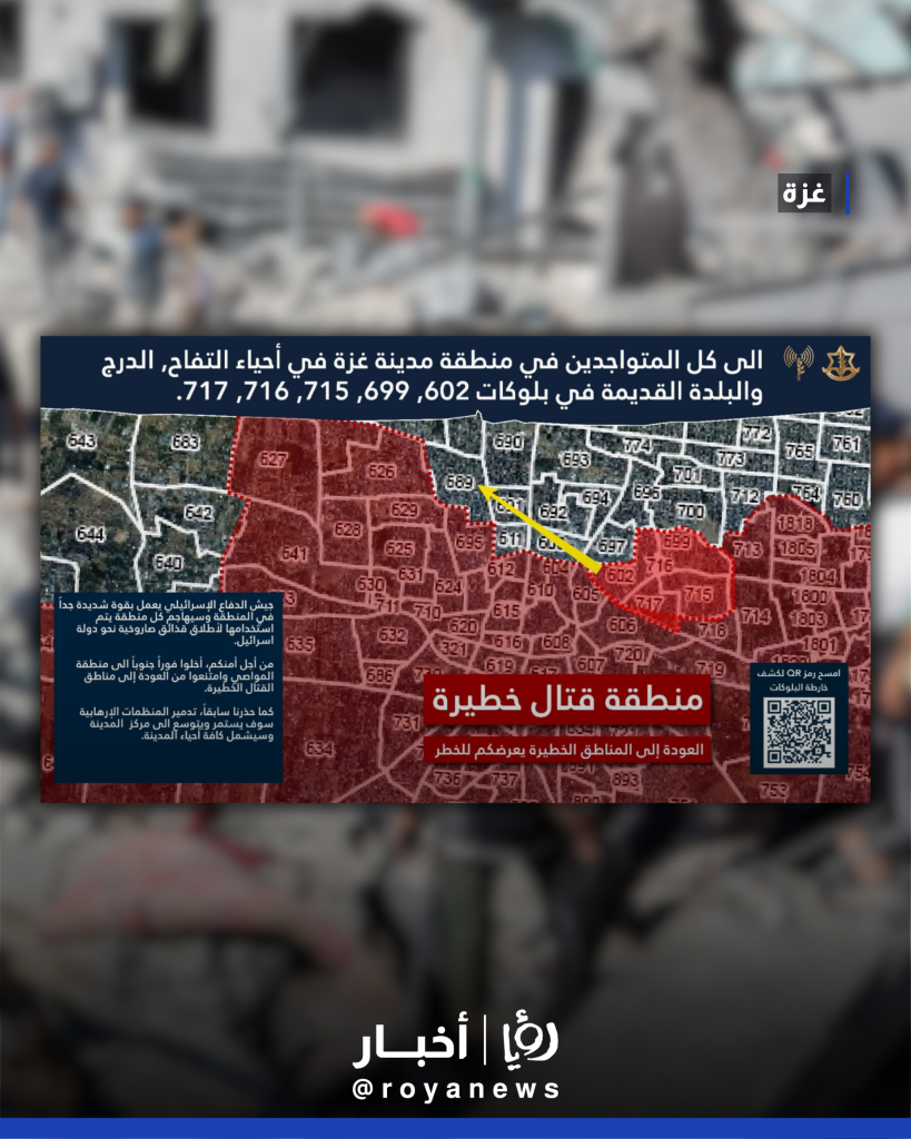 أنذر جيش الاحتلال الإسرائيلي، الأربعاء، بإخلاء أحياء التفاح والدرج والبلدة القديمة بغزة، وبشكل خاص في البلوكات 602، 699، 715، 716، و717، مطالبا المدنيين بإخلاء هذه المناطق "فورا" والتوجه جنوبا نحو منطقة المواصي.