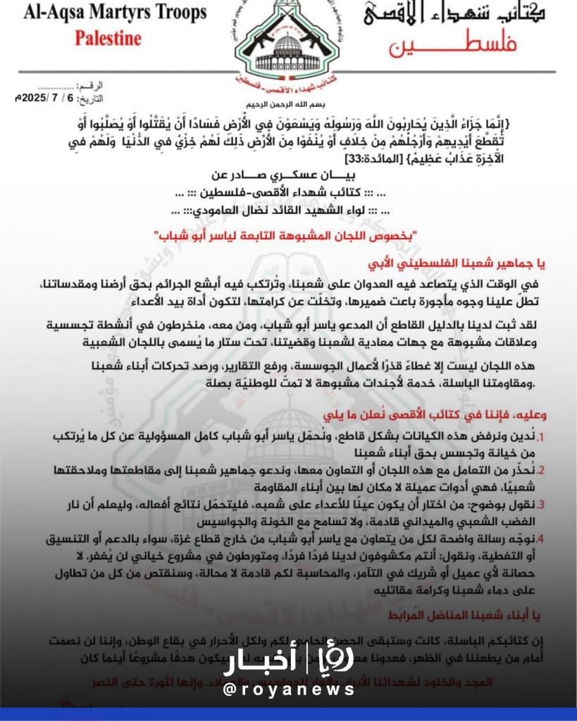 أصدرت "كتائب شهداء الأقصى - لواء العامودي" في قطاع غزة ، الأحد، بيانا شديد اللهجة وجهت فيه ما وصفته بـ"رسالة أخيرة" إلى أشخاص قالت إنهم "تورطوا" مع شخص يدعى ياسر أبو شباب، تحت غطاء "اللجان" و"الوطنية الكاذبة".