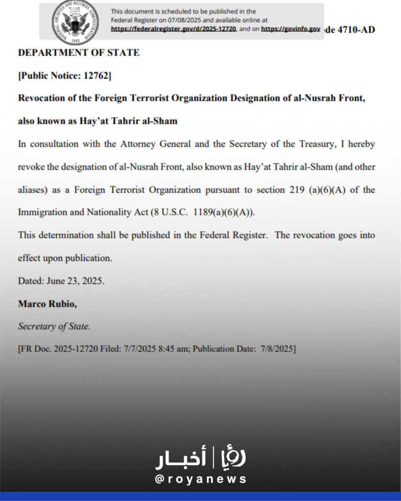 19:19 2025-07-07|- واشنطن: إلغاء تصنيف جبهة النصرة كمنظمة إرهابية أجنبية وفقا للمادة 219 من قانون الهجرة والجنسية