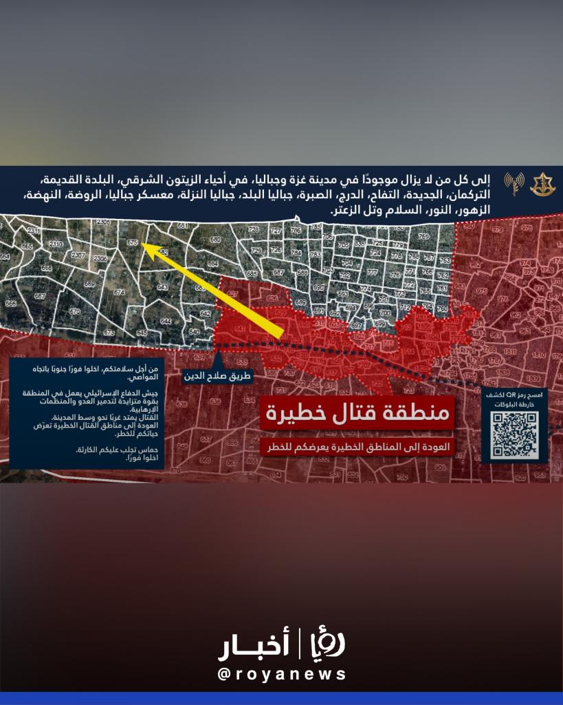 أصدر المتحدث باسم جيش الاحتلال الإسرائيلي، أفيخاي أدرعي، تحذيرا عاجلا للمدنيين المتواجدين في عدة مناطق في مدينة غزة وبلدة جباليا، مطالبا إياهم بإخلاء مناطقهم فورا والتوجه جنوبا نحو المواصي.