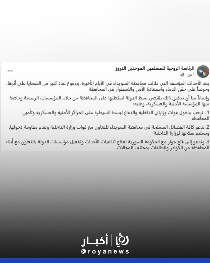 أصدرت جهة تعرف نفسها باسم "الرئاسة الروحية للمسلمين الموحدين الدروز" بيانا، يوم الثلاثاء، دعت فيه إلى بسط سيطرة الدولة السورية على محافظة السويداء وتسليم الفصائل المحلية لأسلحتها.