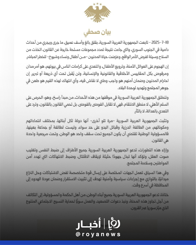 وأضافت الرئاسة السورية أنه لا يتم الرد على الفوضى بالفوضى، بل يتم حماية القانون بالقانون، والرد على التعدي بالعدالة. وأكدت أن سوريا هي دولة لكل أبنائها، بمختلف انتماءاتهم ومكوناتهم، سواء من الطائفة الدرزية أو البدو.