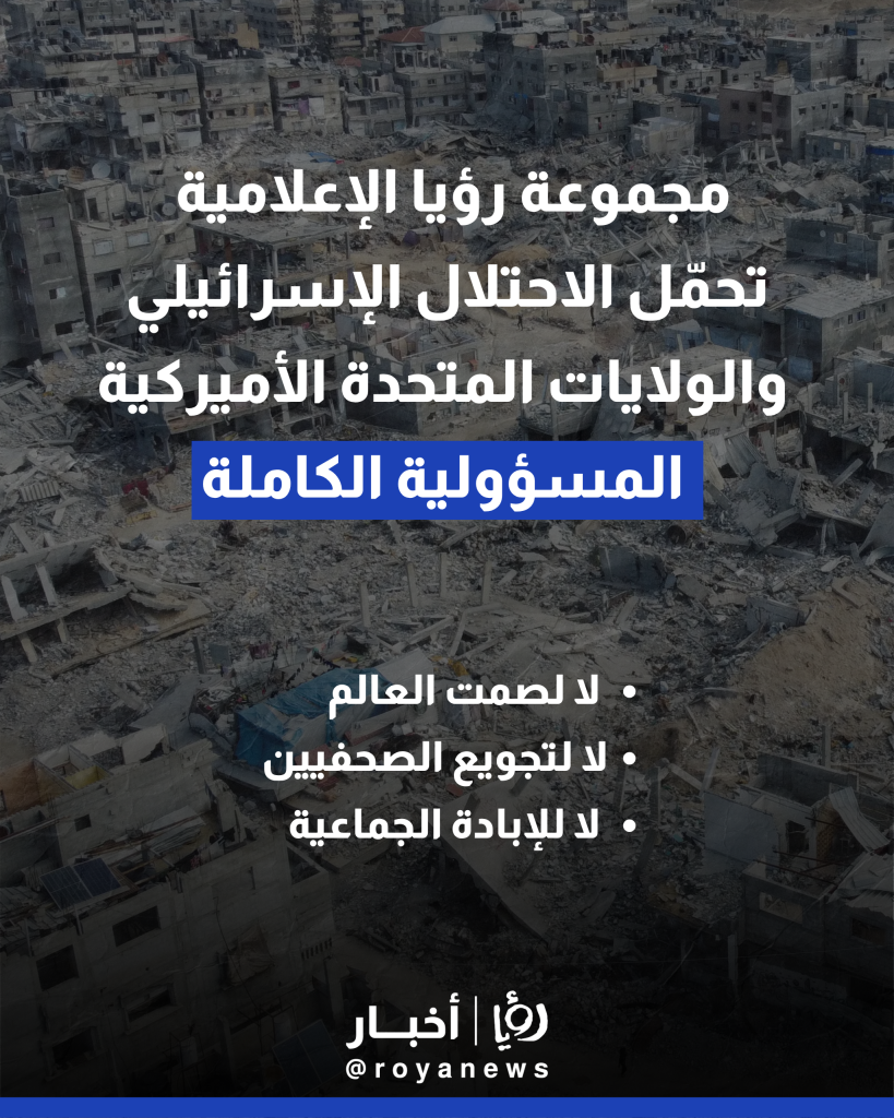 تحمل مجموعة رؤيا الإعلامية سلطات الاحتلال الإسرائيلي، والدولة الداعمة له، الولايات المتحدة الأميركية، المسؤولية الكاملة والمباشرة عن أي مساس بحياة طاقمها، أو استهدافهم، أو تعمد تجويعهم، أو منعهم من أداء واجبهم المهني والإنساني.