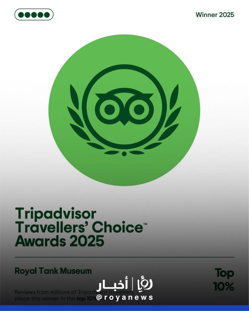 فاز متحف الدبابات الملكي بجائزة "خيار المسافرين لعام 2025" من منصة (TripAdvisor)، أكبر منصة سياحية في العالم.