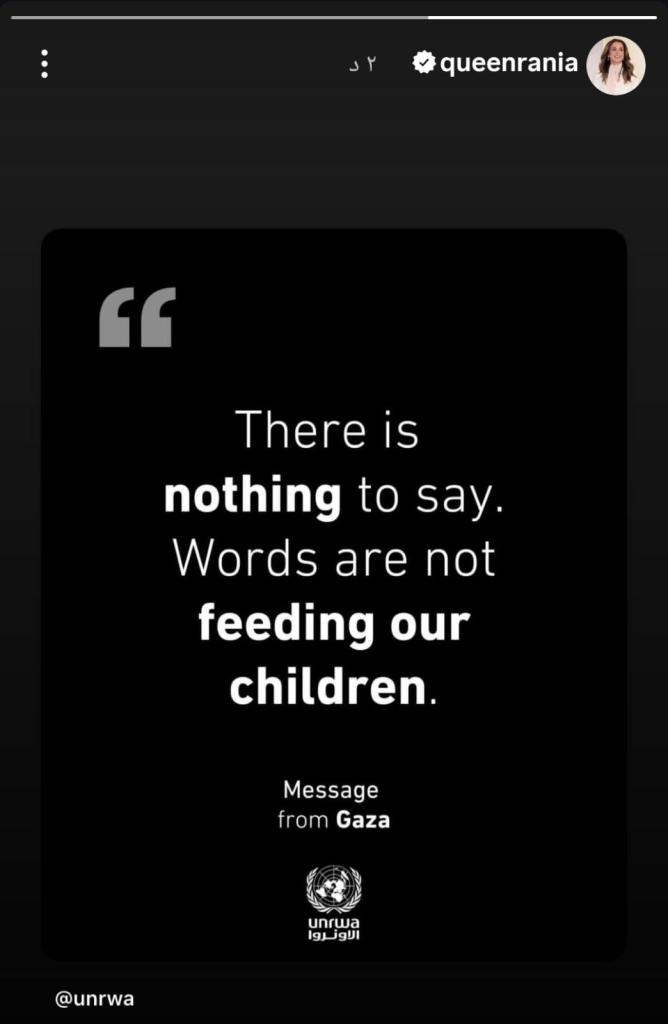 وجاء في الرسالة التي أعادت نشرها الملكة رانيا: "لا يوجد ما يمكن قوله. الكلمات لا تطعم أطفالنا.. رسالة من غزة."