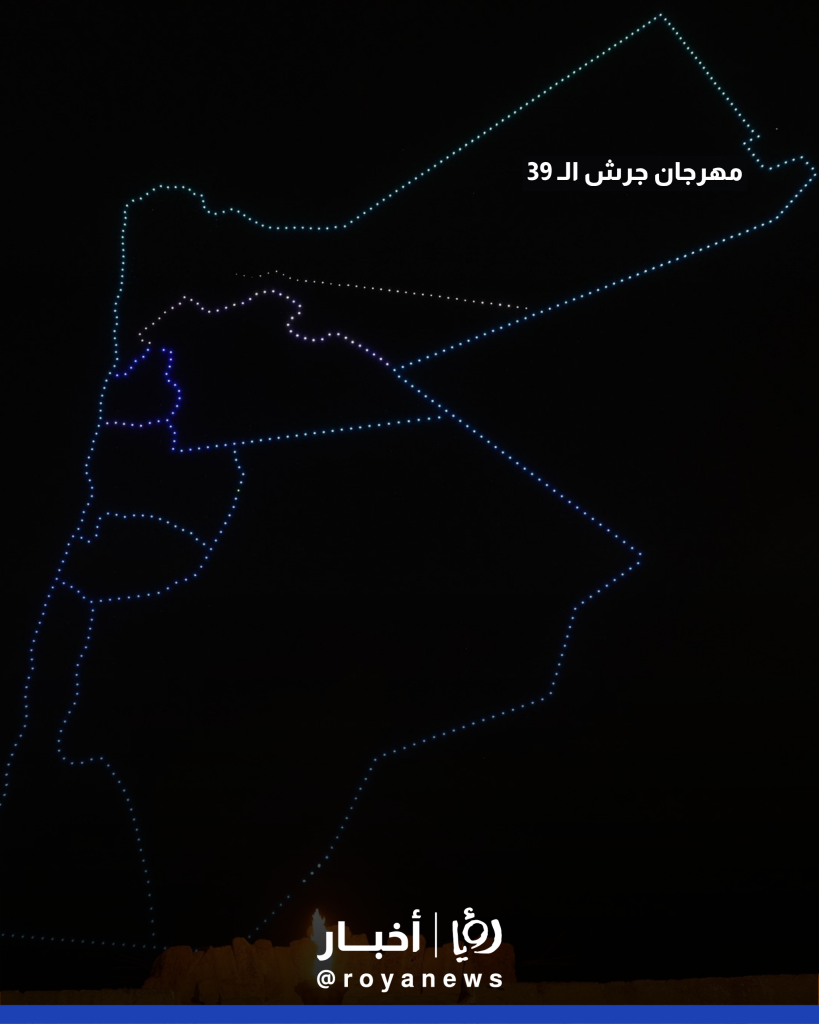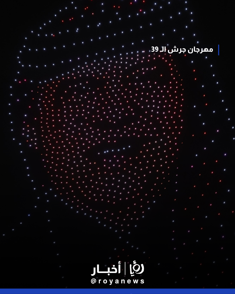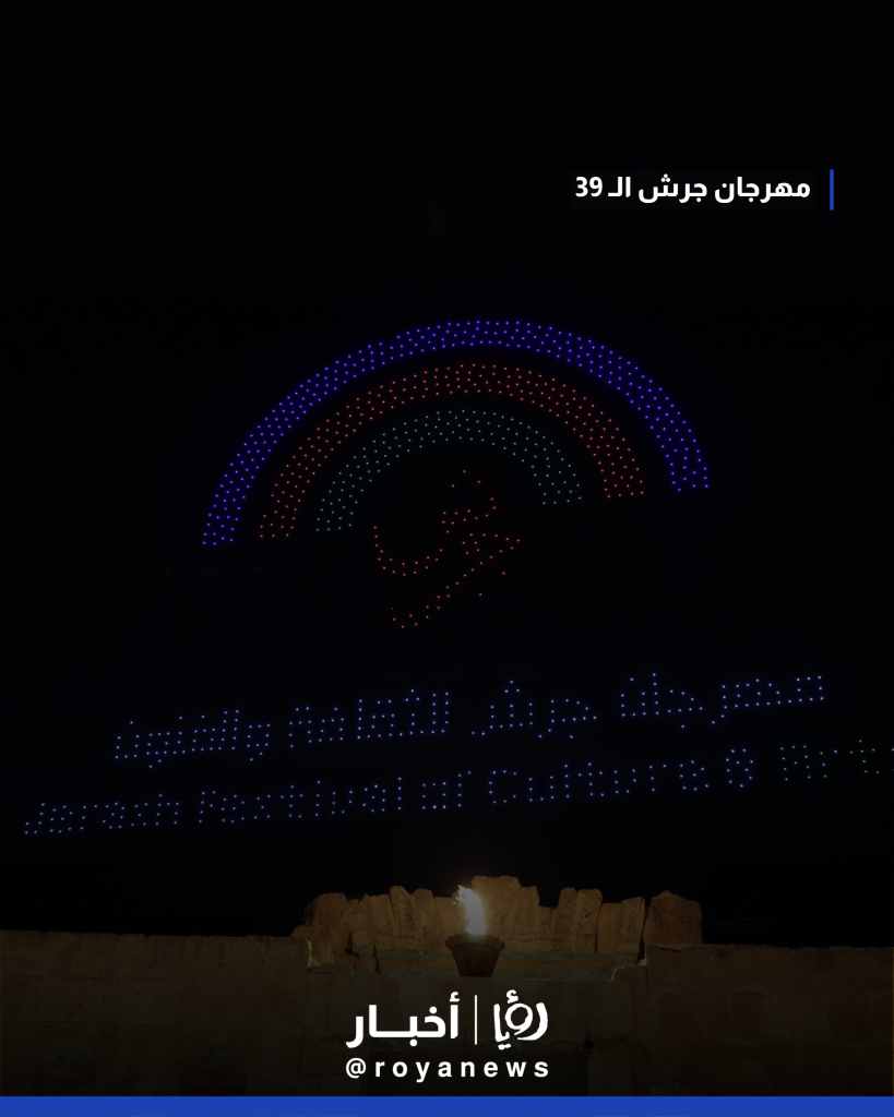 وتزينت سماء جرش بعروض درون تضمنت صورا لجلالة الملك وولي العهد، وشعلة المهرجان وشعاره، وصورا للمدينة الأثرية، وعلم الأردن.