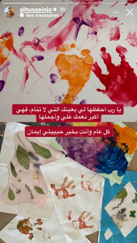 ونشر سمو ولي العهد، عبر خاصية "الستوري" على انستغرام، مجموعة من الرسومات التي رسمتها سمو الأميرة إيمان، كتب عليها، "يا رب احفظها لي بعينك التي لا تنام، فهي أكبر نعمك علي وأجملها.. كل عام وأنت بخير حبيبتي إيمان".