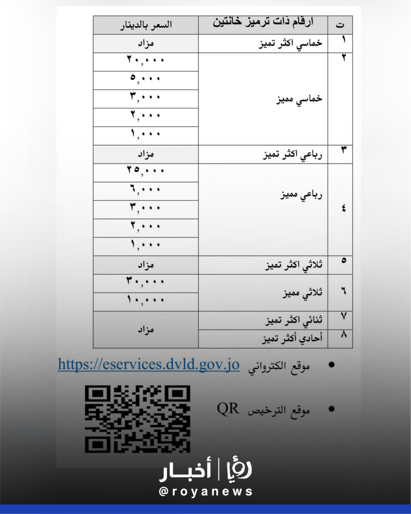 - إدارة ترخيص السواقين والمركبات تعلن فتح بوابة شراء الأرقام المميزة ترميز (1) من غير الخاضعة للبيع بالمزاد غدا الساعة الخامسة مساء