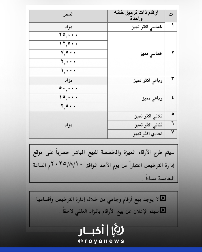 23:30 2025-08-09|- إدارة الترخيص تنشر قوائم الأسعار الخاصة بكل فئة من الأرقام الجديدة على موقعها الإلكتروني