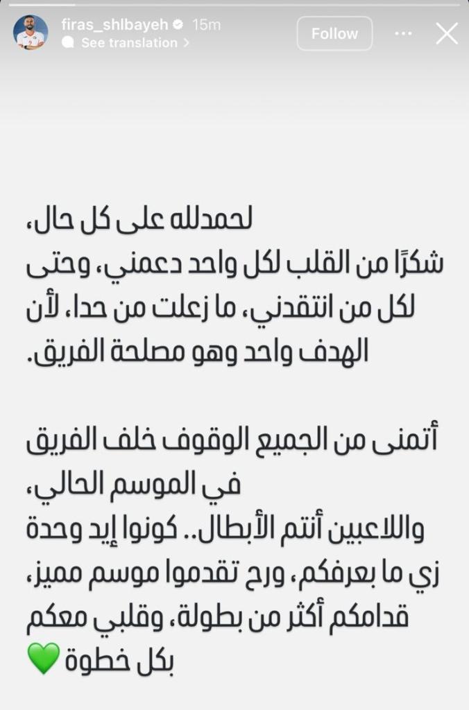 ونشر اللاعب رسالة مؤثرة عبر "انستغرام" طالب فيها بدعم الفريق، أكد من خلالها ثقته بلاعبي الوحدات.