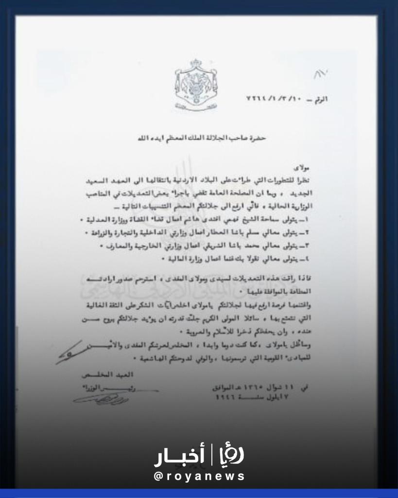 كشف مركز التوثيق الملكي الأردني الهاشمي، اليوم الثلاثاء، عن وثيقة تاريخية بالغة الأهمية، تسلط الضوء على واحدة من أولى الممارسات الدستورية في المملكة، وهي أول طلب تعديل وزاري في تاريخ الدولة الأردنية الحديثة، بعد أشهر قليلة فقط من نيل استقلالها الكامل عام 1946.