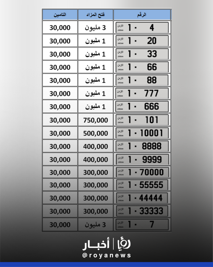 تعلن إدارة ترخيص السواقين والمركبات بالتنسيق مع وزارة المالية واستنادا لأحكام نظام لوحات المركبات وتعديلاته رقم (52) لسنة 2006 عن طرح مجموعة من الأرقام (الأحادية والثنائية والثلاثية والرباعية والخماسية) الأكثر تميزا للبيع بالمزاد العلني الوجاهي.