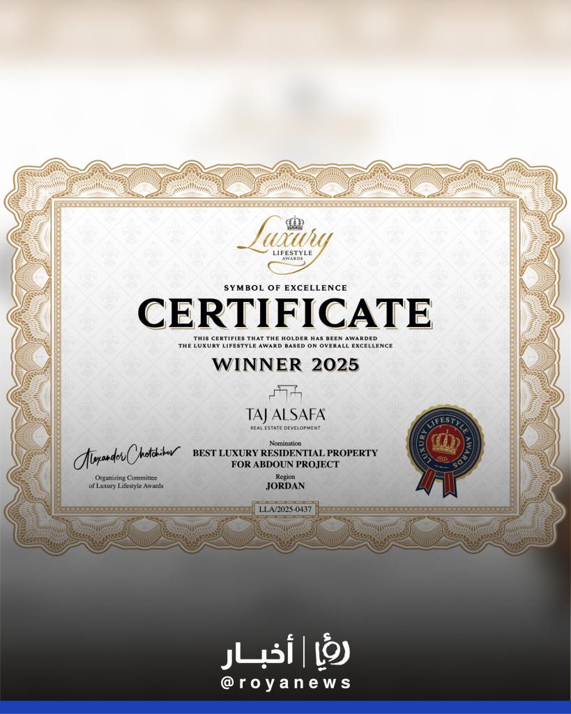 في إنجاز يعكس تطور القطاع العقاري الفاخر في المملكة، حصل مشروع "عبدون بريميوم" التابع لشركة تاج الصفا® للتطوير العقاري بجائزة Luxury Lifestyle Awards 2025 العالمية، وذلك عن فئة أفضل مشروع عقاري سكني فاخر – الأردن.