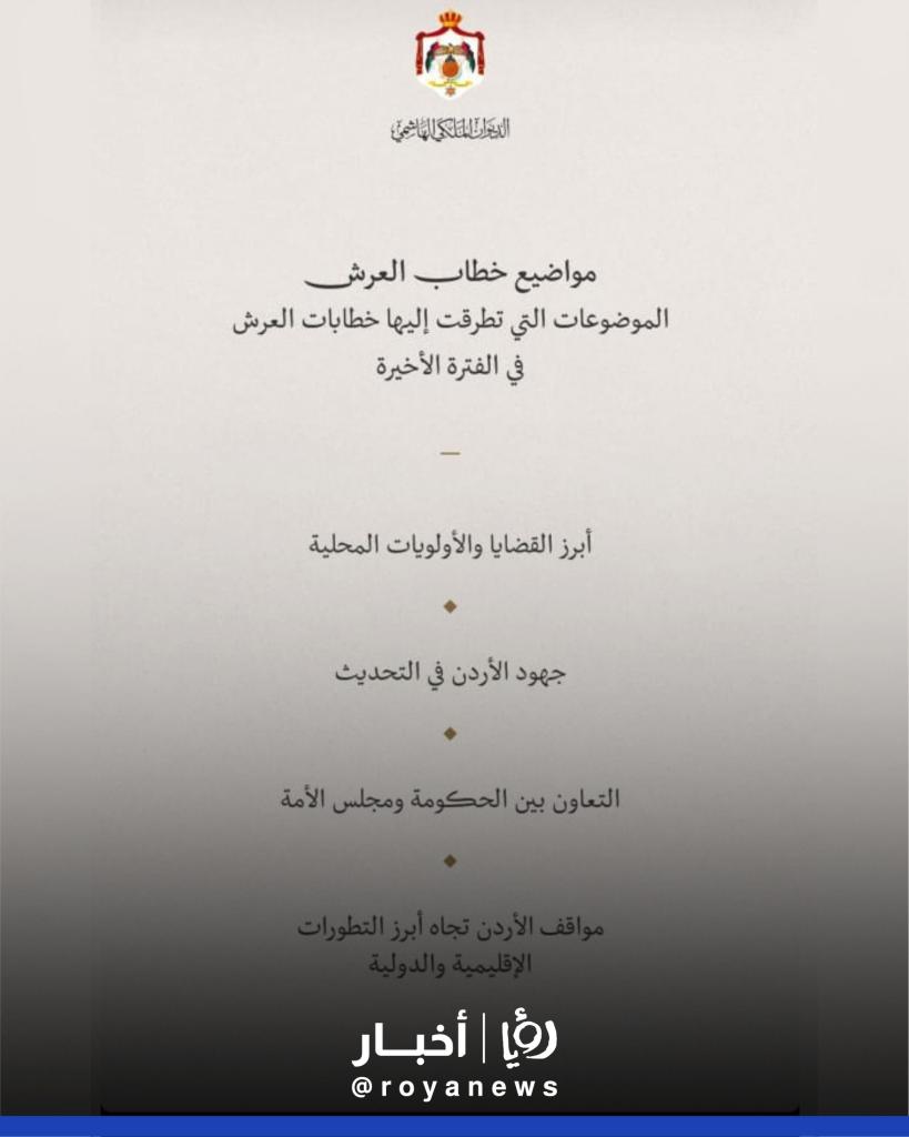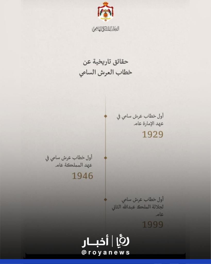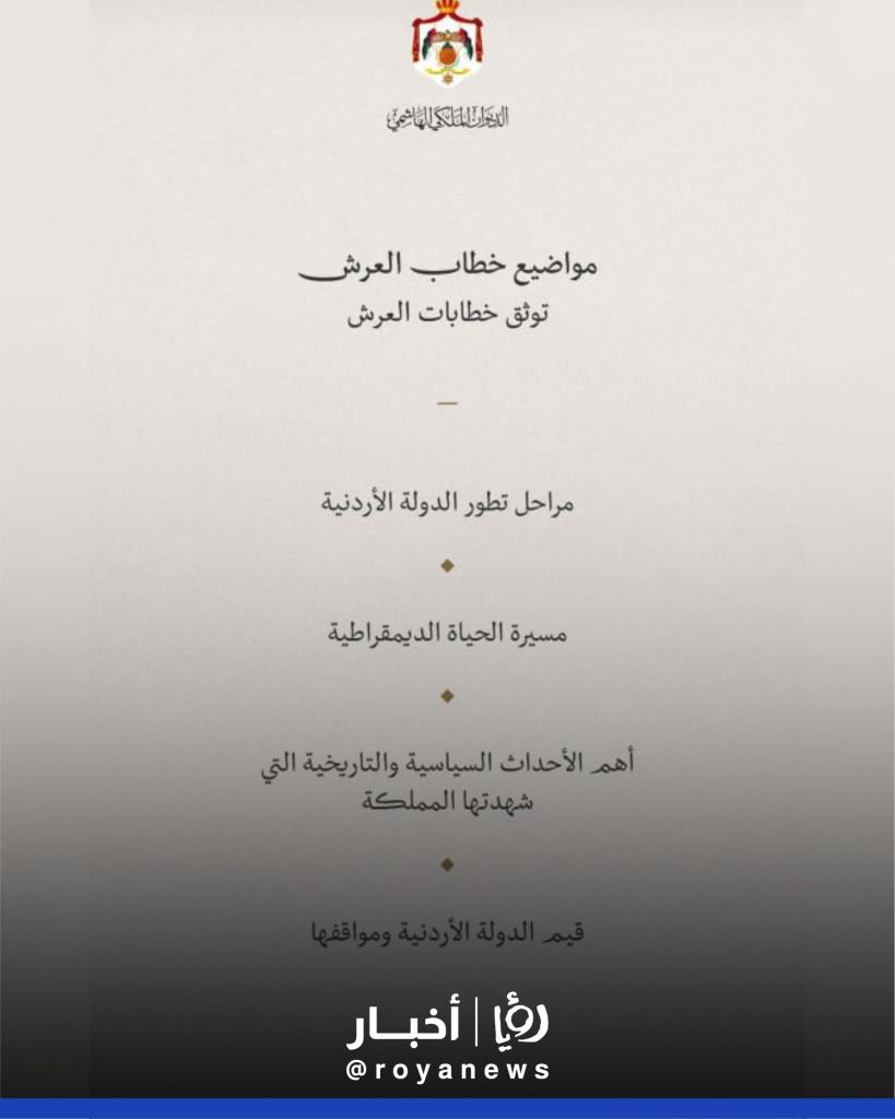 كما أوضح الديوان أن خطابات العرش تعد وثائق تاريخية تؤرخ لمراحل تطور الدولة، ومسيرة الحياة الديمقراطية، وأهم الأحداث السياسية التي شهدتها المملكة، وتعكس قيم الدولة الأردنية ومواقفها.