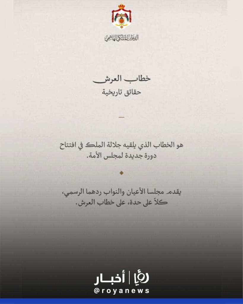 مع اقتراب خطاب العرش السامي يوم الاحد بافتتاح الدورة العادية الثانية لمجلس الأمة، نشر الديوان الملكي الهاشمي، الجمعة، سلسلة من المواد التعريفية عبر خاصية "الستوري" على حساباته في مواقع التواصل الاجتماعي، تناولت "خطاب العرش السامي" من جوانبه الدستورية والتاريخية والموضوعية.