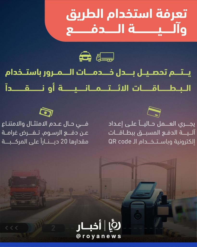 وفي حال مخالفة النظام، "تفرض غرامة مقدارها (20) دينارا" على "مرور المركبة دون سداد الرسوم".
