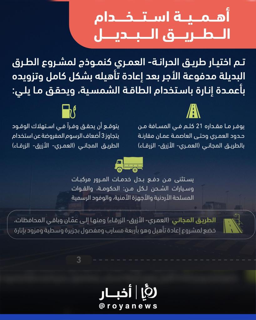 وأوضحت أن "الطريق المجاني المقابل" هو "طريق العمري–الأزرق–الزرقاء"، وهو طريق رئيسي "يربط بدوره بالعاصمة عمان وبقية المحافظات".