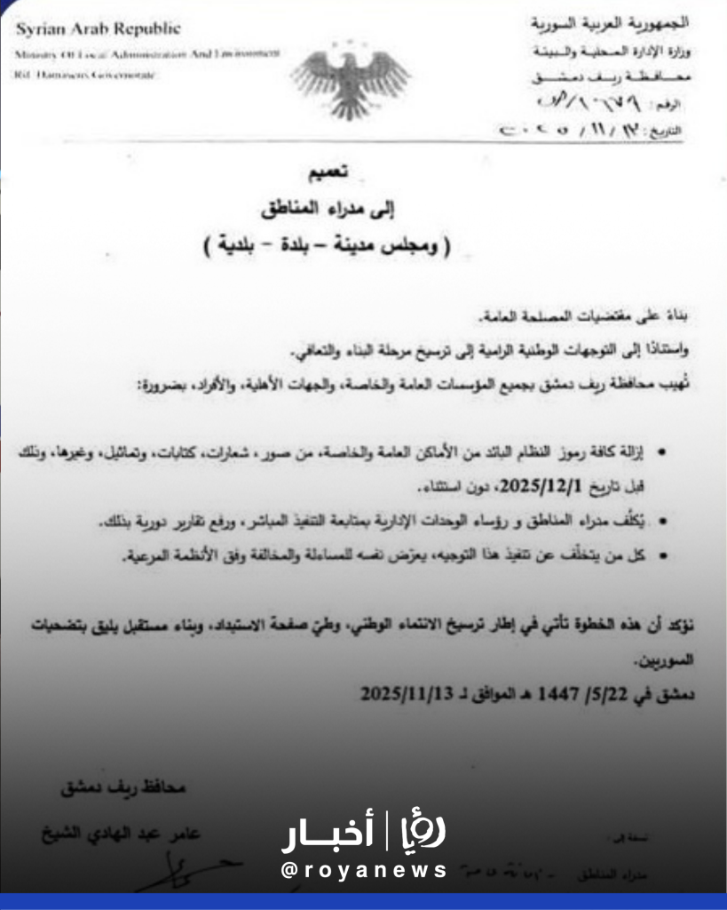 أصدر محافظ ريف دمشق، السيد عامر الشيخ، تعميما مشددا يقضي بإزالة كافة الرموز والمظاهر المرتبطة بـ "النظام السابق" من عموم الأماكن العامة والخاصة دون تفرقة.