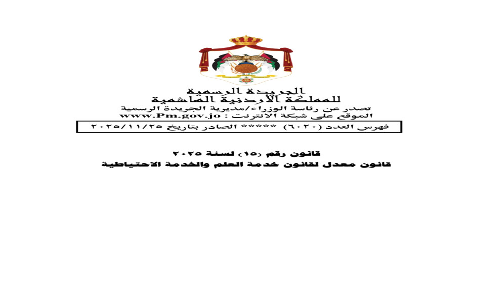 نشرت الجريدة الرسمية في عدد خاص، القانون المعدل لقانون خدمة العلم والخدمة الاحتياطية، بعد إقراره من مجلسي النواب والأعيان، ليصبح نافذا من تاريخ نشره.
