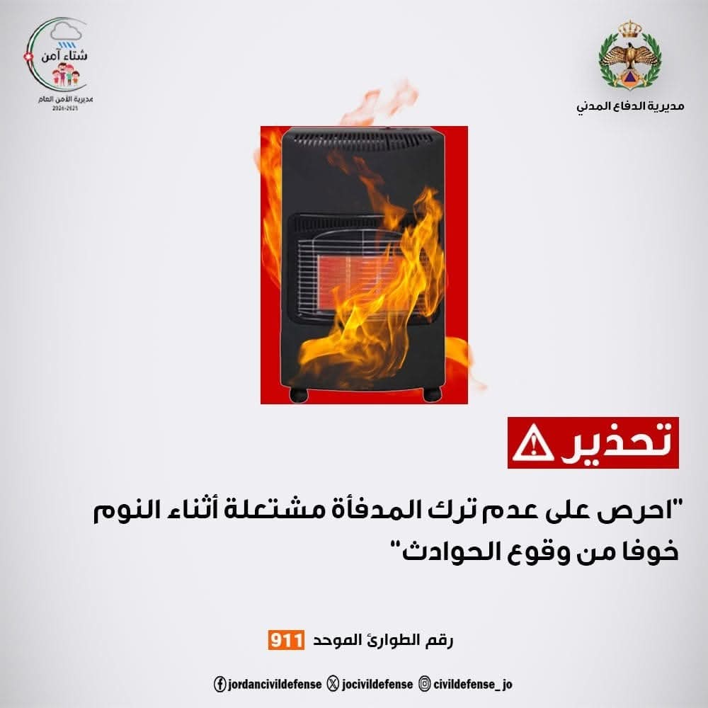 وجددت مديرية الدفاع المدني تحذيراتها من ترك المدفأة مشتعلة أثناء النوم؛ خوفا من وقوع حوادث الاختناق والحرائق.