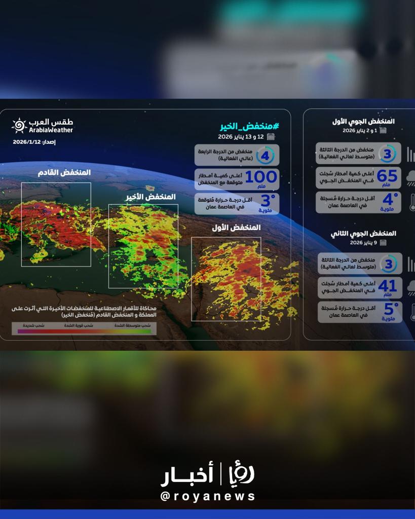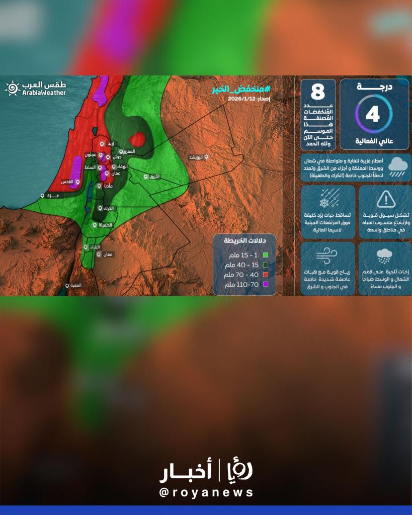 ويتعرض الأردن لمنخفض جوي عالي الفعالية من الدرجة الرابعة، يعد الأقوى منذ بداية موسم الشتاء 2025/2026، حيث بدأ تأثيره اعتبارا من ليلة الإثنين/ الثلاثاء، على أن تبلغ ذروته يوم الثلاثاء، وفق "طقس العرب".