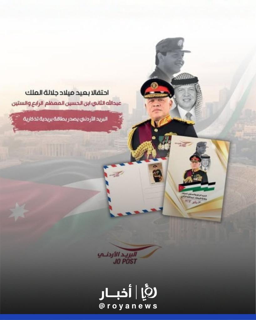 طرحت شركة البريد الأردني، بطاقة بريدية تذكارية خاصة بمناسبة عيد ميلاد جلالة الملك عبد الله الثاني الـ(64)، اعتبارا من يوم 29 كانون الثاني الحالي، وبقيمة 1.40 دينار للبطاقة الواحدة.