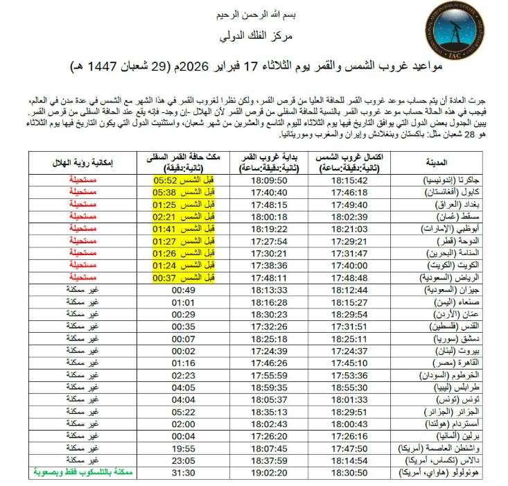 ويشمل هذا التحري الدول التي يوافق فيها يوم الثلاثاء (17 شباط) اليوم التاسع والعشرين من شعبان.