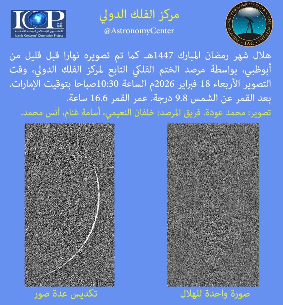 نجح مرصد الختم الفلكي التابع لمركز الفلك الدولي في العاصمة الإماراتية أبوظبي، في تصوير هلال شهر رمضان المبارك لعام 1447هـ "نهارا"، في خطوة علمية تؤكد ولادة الهلال وإمكانية رصده بتقنيات فلكية متقدمة.
